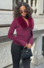 In Focus: Knitwear. The All Bundled Up Knit Cardigan in Burgundy is crafted from unlined high‑stretch knit fabrication, featuring a V‑neckline with a detachable fur collar, full button‑front closure, long sleeves and a relaxed silhouette. Style fashion pants with boots for a chic, city-night fit.