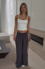Escape into weekend elegance. The Distant Memories Pants in Charcoal marry a slim drawstring waist with a relaxed wide-leg silhouette in lightweight, unlined fabric. A subtle double-stripe detail down each side injects a hint of sporty sophistication. Pair with a basic tank, sandals and sunnies for a chill weekend fit.
