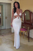 Channel your inner goddess in the Electric Memories Maxi Dress Pearl! This maxi length silhouette features a chain halter neckline adorned with chunky beadwork which can be worn straight or crossed at the front. Designed with integrated grip tape at bust, and purposeful cut-out at the waist framed with coordinating chains and beads. Crafted from a high‑stretch, lined fabric, it's elegantly backless. Finish the look by making those heels speak and let your layered jewels do the talking.