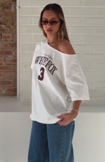 BRB adding to cart! The Everything In Time Off‑Shoulder Oversized Tee in White features a relaxed, oversized fit with slouchy shoulders and an off‑the‑shoulder neckline, punctuated by a bold printed logo at center front. Pair it with a sporty skort and sneakers for a chic, effortless look.
