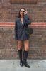 Office-siren energy in the High Line Blazer in Navy Pinstripe. It features a tailored collar, padded shoulders, long sleeves with button-detail cuffs, a centre-front button closure, functional front pockets, oversized silhouette and a classic pinstripe pattern. Style it with the matching bustier and pants or skirt, add kitten heels, and own every room you walk into.