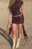 Free spirit season. The It Will Work Out Studded Mini Skort Dark Chocolate features a thin elastic waistband, studded detailing across the front, and fringe accents down the side. Designed in a high-stretch fabrication with built-in shorts. Style it with the matching It Will Work Out Studded Top Dark Chocolate and cowboy boots for the ultimate festival-ready look.
