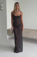 Linger under golden skies in the Just For Me Maxi Dress in Black/White Polka Dot! This full-length, backless design features adjustable spaghetti straps that cross at the back, offering a customizable fit. The cowl neckline adds a touch of sophistication, while the sheer fabric makes it an ideal layering piece over your favorite bikini. Style with layered gold jewellery and simple sandals.