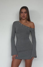 The perfect concert fit has arrived! Introducing the Live Loud Long Sleeve Mini Dress in Charcoal. Features one shoulder neckline with silver eyelet detailing, long flared sleeves, mini length, high stretch fanrication and lined. Pair with kitten heels to dance the night away!