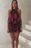 The ultimate cool-girl dress has arrived! Our No Second Thoughts Halter Mini Dress Black Scarlet Bloom features thin halter straps tied at the nape, loosely fitted bodice, fixed hemline on waist, ruched detailing down skirt side, ruffle hemline on skirt, invisible zipper on side, backless and lined. From beach clubs to dinner dates, she's got an effortless feel when paired with heels and layered gold jewellery.