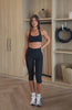 The active style of the season: capris. The Powerhouse Capri in Black features a supportive thick waistband, a flattering capri length, and high‑stretch fabrication for comfort. Unlined for a lightweight feel, it’s finished with printed WFA initials at the center back for a signature look. Style with the matching crop or tank for a cute set.