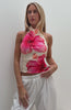 The Time Passes Halter Top Hibiscus is dance-floor approved. Features a cowl neck, halter style design with button closure at back, backless design with adjustable back ties, fully lined, and high shine, silky fabric. Pair with your go-to jeans, gold accessories and perspex heel for a stunning look!