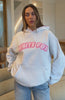 Unwind in style. The Vol. 1 Front Graphic Oversized Hoodie Grey Marle features a relaxed double-lined hood with exposed stitching, slouched shoulders and ribbed hems, which round out an oversized silhouette. Featuring long sleeves, a roomy front pocket, and an unlined fleece interior, this hoodie delivers a cosy feel. White Fox borg text embellishes the centre front, paired with a printed "made with love" text side back. Style with your go-to denim jeans and layered gold jewellery for a chill weekend fit.