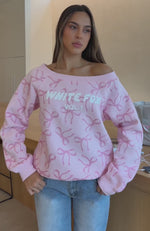 Unwind in style with our prettiest loungewear yet. The Vol. 1 Off Shoulder Printed Sweater in Posy Bow is designed with an off-the-shoulder neckline and ribbed hems, which round out an oversized silhouette. Featuring long sleeves and an unlined fleece interior, this hoodie delivers a cosy feel. White Fox puff print text embellishes the centre front. Style with your go-to denim jeans and colour sneakers for the cutest fit!
