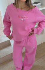 Comfort is an attitude, and this set embodies it. The Vol. 1 Off Shoulder Sweater Bubblegum is designed with an off-the-shoulder neckline and ribbed hems, which round out an oversized silhouette. Featuring long sleeves and an unlined fleece interior, this hoodie delivers a cosy feel. White Fox borg text embellishes the centre front. Style with the matching Vol. 1 Wide Leg Sweatpants Bubblegum.