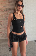 The brief: Cheeky. Slide into the Wild Attraction Mini Shorts in Black, featuring a delicate lace-trimmed elastic waistband, a playful frill sash tied at the hip, and a clingy booty-length cut in high-stretch fabric for unapologetic, bold comfort. Layer with the Closer To Forever Halter Top and chunky gold jewellery for a dream festival fit.